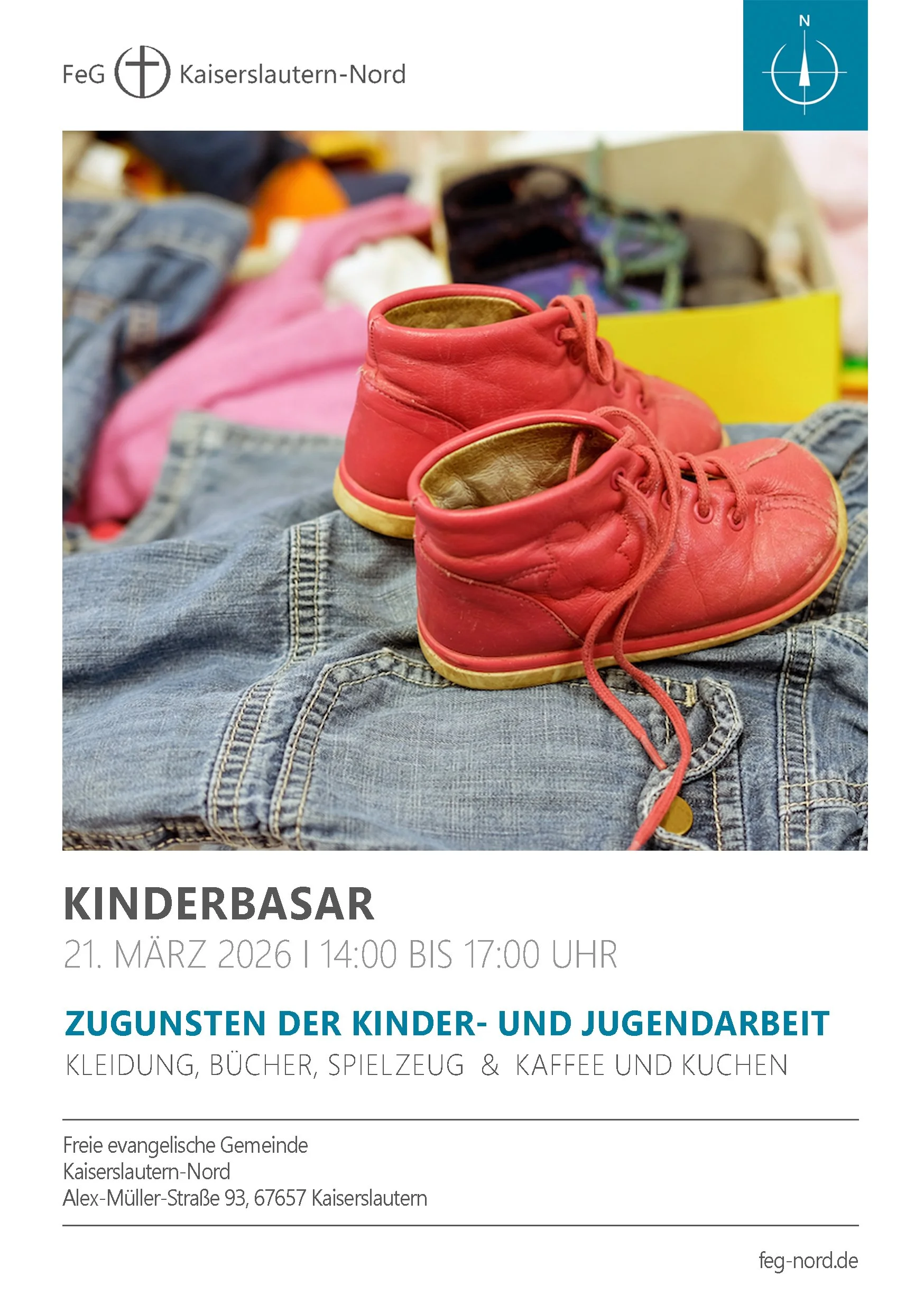 Wir laden herzlich ein zum Kindersachenbasar der FeG Kaiserslautern-Nord am Samstag, 21. März 2026, von 14:00 bis 17:00 Uhr.